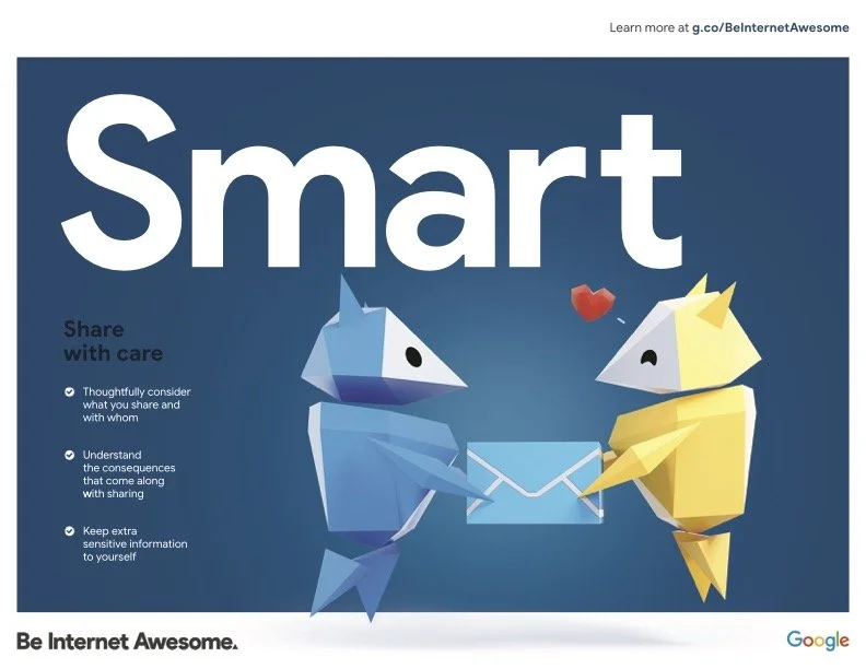 Being internet smart focuses on two types of skill building: sharing within the family (each other’s devices, accounts, passwords) and sharing outside the family (personal information, photos, friending within games).